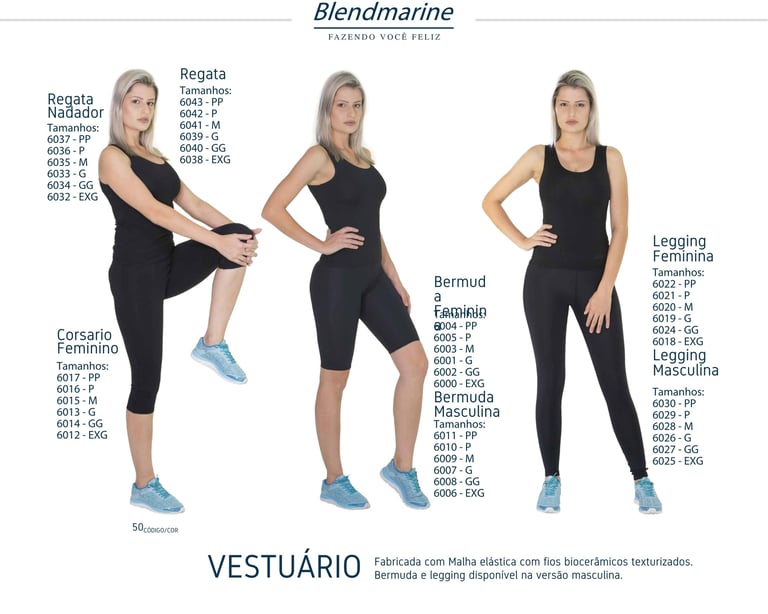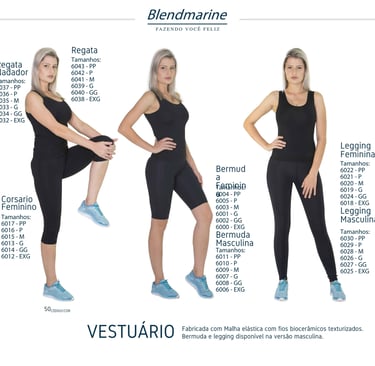 Fabricada com Malha elástica com fios biocerâmicos texturizados. Bermuda e legging disponível na versão masculina.