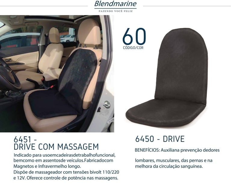 Indicado para uso em cadeiras de trabalho funcional, bemcomo em assentosde veículos.Fabricadocom Magnetos e Infravermelho longo. Dispõe de massageador com tensões bivolt 110/220 e 12V. Oferece controle de potência nas massagens.